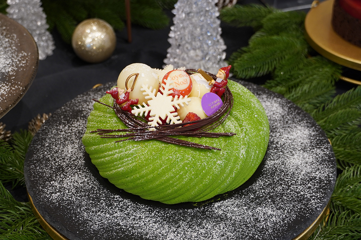 クリスマスリースをイメージしたケーキ。緑色はピスタチオのムース。ライチの風味を合わせています。中には、トンカ豆を合わせたグロゼイユのガナッシュ。土台のスパイシーなビスキュイがアクセントとなっています。