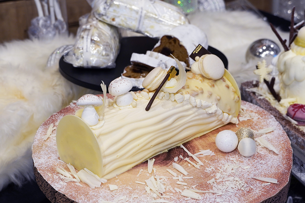 真っ白なブッシュ・ド・ノエル。高知県産柚子を使用した爽やかなムースです。中には、ピスタチオのダックワーズとレモンジンジャークリーム、甘酸っぱいベリーのジュレ。土台には、黒ゴマビスキュイとゆずのクランチが敷かれています。爽やかな酸味の中に黒ゴマの風味が効いていて、とてもマッチしています。