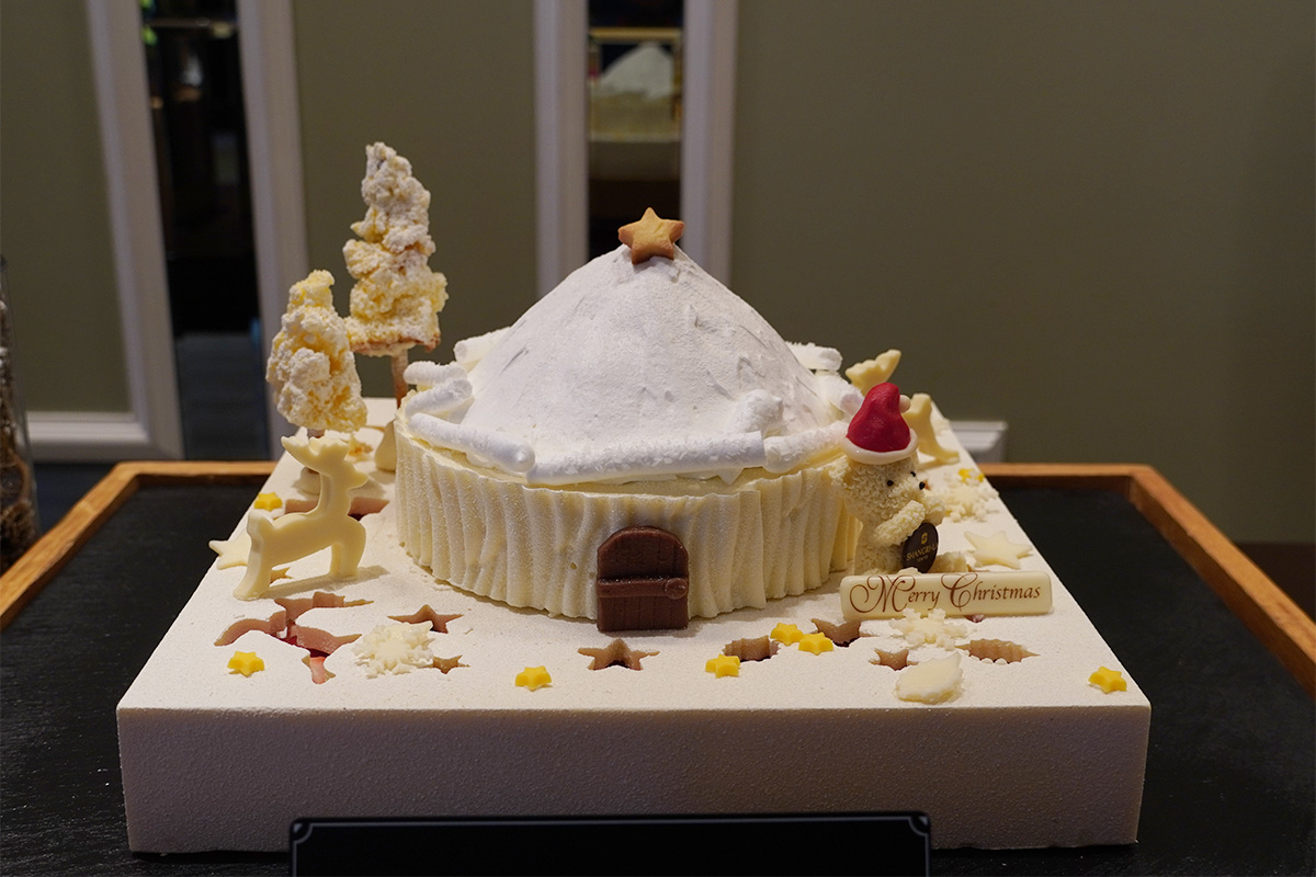 「クリスマスハウスケーキ」は、シャングリ・ラ ベアやトナカイ、雪の家が飾られた特別なケーキ。雪の家はチーズケーキとストロベリーショートケーキでできています。また、ホワイトチョコレートのボックスを開けると、大きなストロベリーショートケーキが中から登場します。