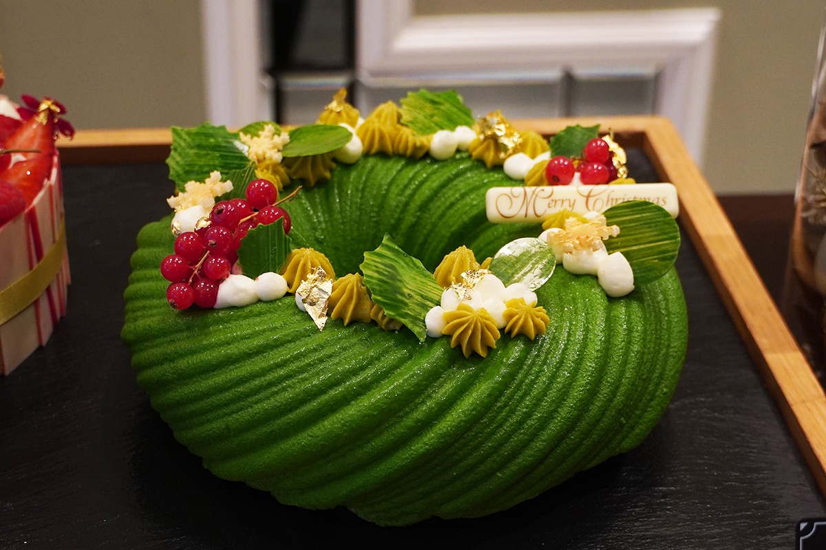 冬の森に飾られたリースをイメージした「クリスマスリースケーキ」。緑色はピスタチオムースです。中はパンデピス、あまおうゼリーやドライフルーツ、香ばしいビスキュイノワゼットなど層が重なります。ドライフルーツの風味とピスタチオの香ばしい味わいの組み合わせが面白い注目の一品です。
