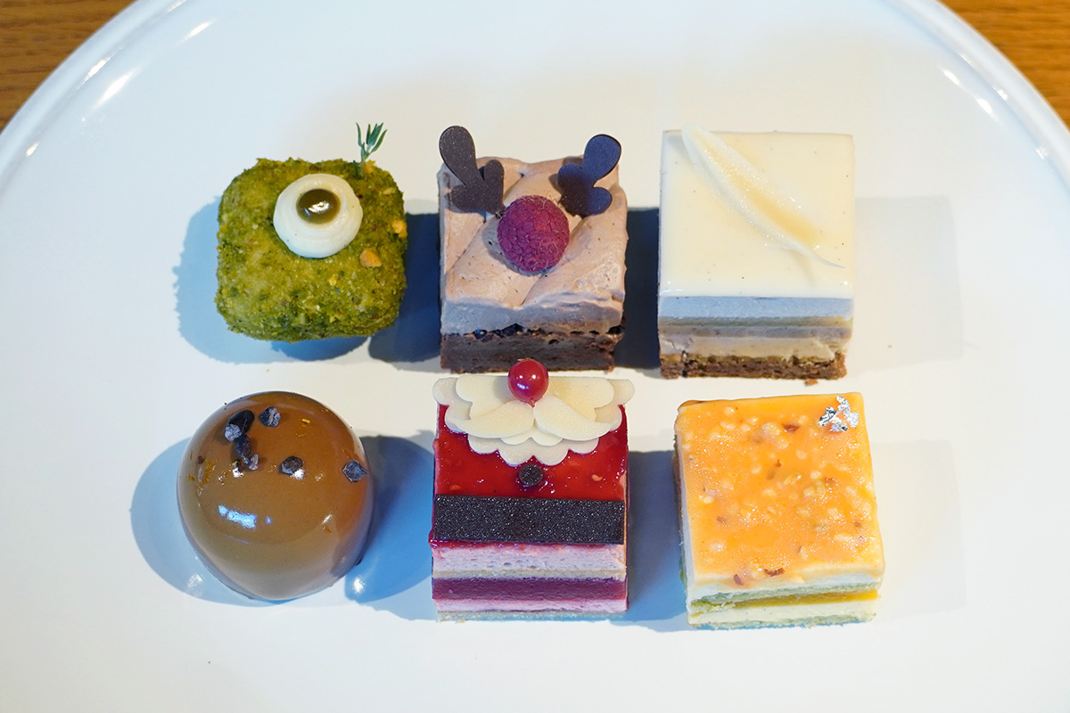 小ぶりなケーキを6種類詰め合わせた、贅沢なアソートボックス。「栗と洋梨ムース」「レモン・バナナ・バジルムース」が「BEYOND1」、「プラリネカフェ」「ピスタチオムース」が「BEYOND2」、「ショコラトナカイ」「ベリーサンタムース」が「BEYOND3」に分類されています。