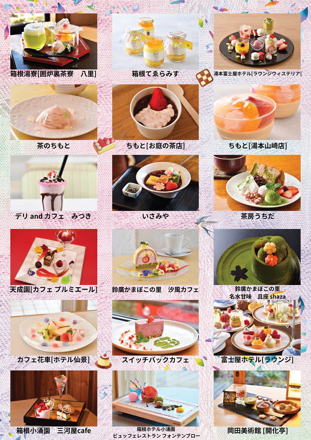 ちもとではお庭の茶店、湯本山崎店、茶のちもとの3店舗でそれぞれ違ったスイーツを用意。各店桜をイメージした和テイストのスイーツを販売します。
