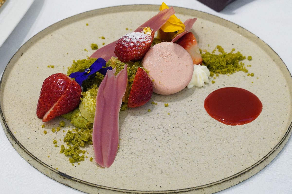 パティシエが作る本格デセール。華やかな見た目も魅力的ですが味も絶品。苺、ピスタチオのムース、ルビーチョコなどさまざまな味わいに、足柄茶のクランブル、砕いたタルトのザクザク食感がアクセント。一皿で存分に楽しめます。
