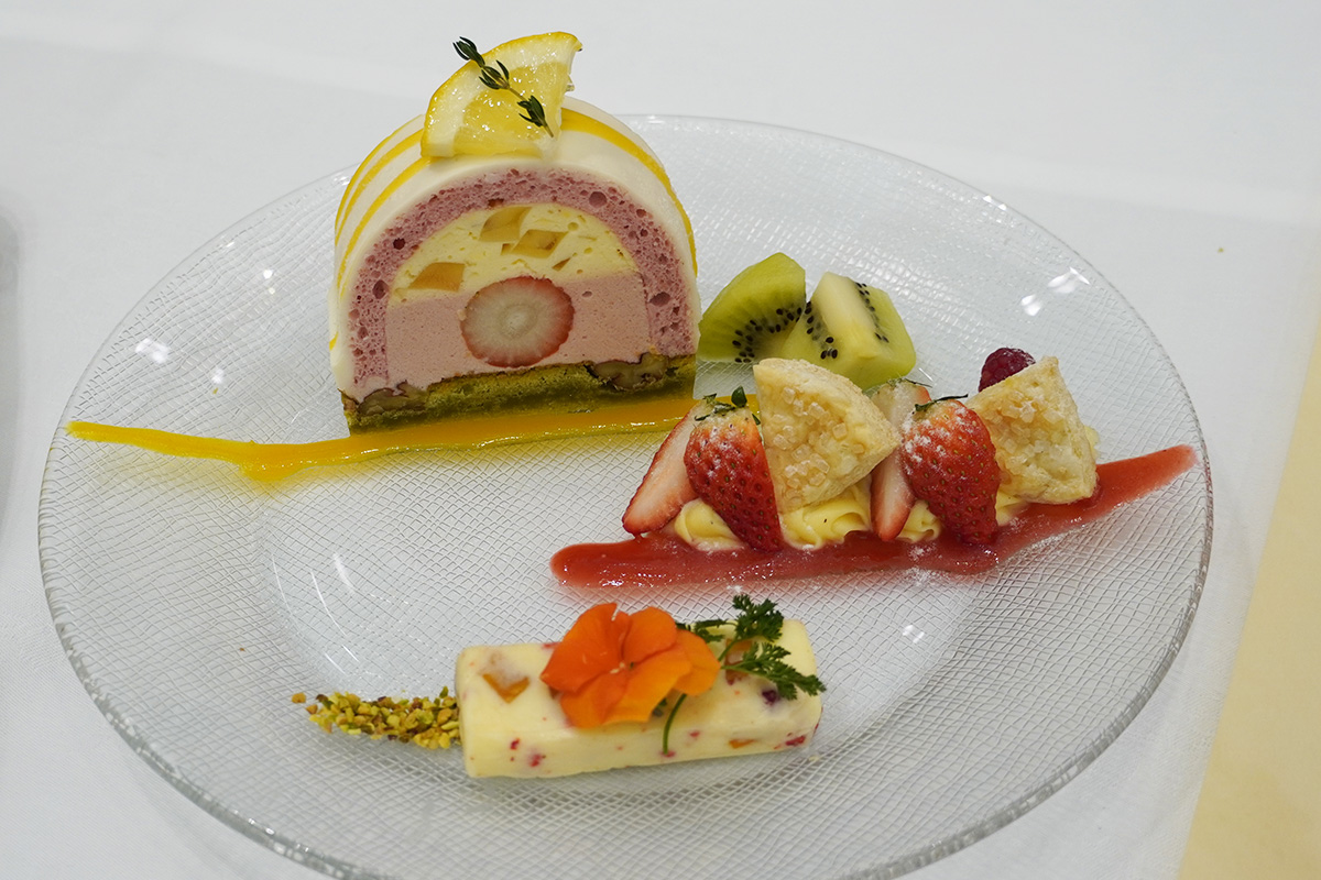 かまぼこの形に整形された、見た目も楽しいケーキ。苺にレモンムースを合わせています。レモンの酸味が効いていてスッキリした味わい。ケーキプレートでは、パイやジェラートも添えられています。