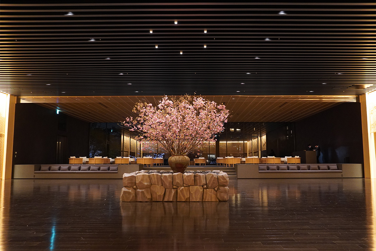 館内のホール中央には桜の木が飾られています。贅沢な空間です。