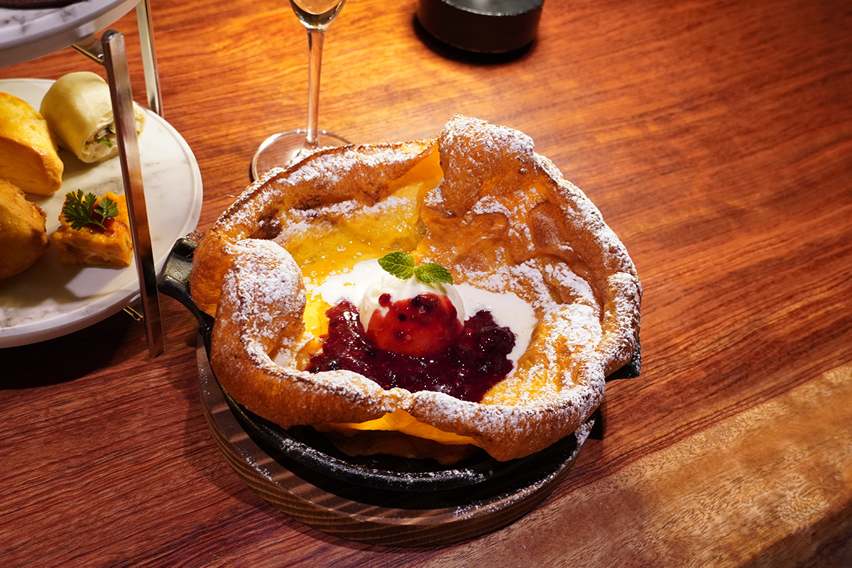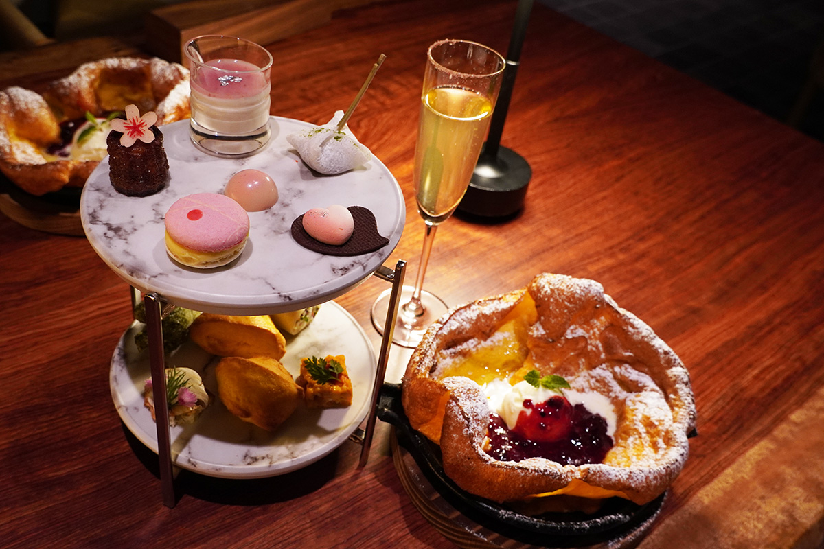 「SAKURA Afternoon Tea」では、6種のスイーツと4種のセイボリー、スコーンとドリンク、さらにダッチベイビーというパンケーキがセットに。また桜のカクテルもついてきます。
