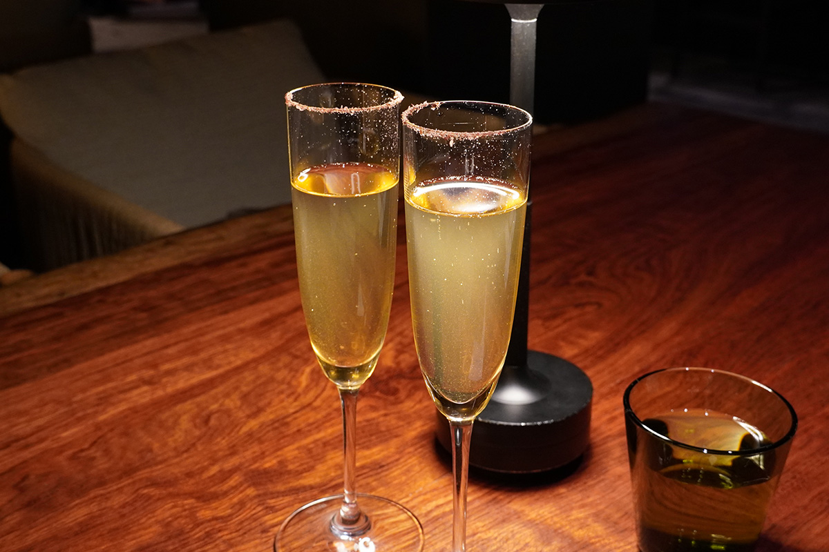 桜のカクテル「春香」(アルコール・ノンアルコールから選べます)は、桜シロップと煎茶を合わせています。グラスの縁にソルティドッグのように塩がまぶしてあり、甘じょっぱい桜の風味を楽しめます。