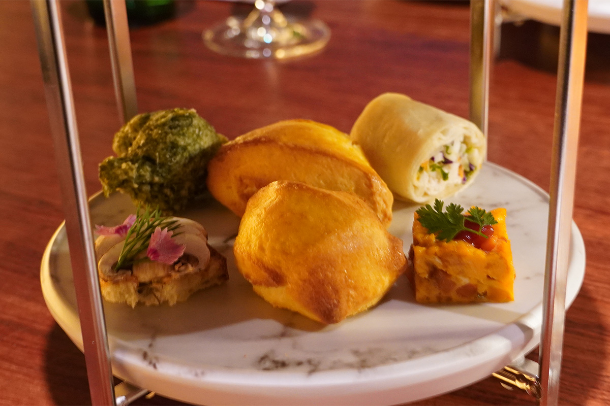 セイボリーは、「スパニッシュオムレツ」「マッシュルームとサーモンのカナッペ」「チャイニーズチキントルティーヤ」「ゼッポリーニ「吉野川産すじ青のり」。