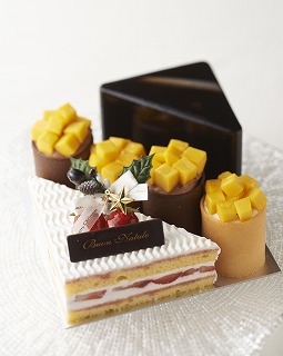 ①マルキーズ: オレンジリキュールをアクセントにきかせた濃厚なチョコレートケーキ ②マンゴートライフル ホワイトチョコレート(2ピース):ホワイトチョコレートをコーティングしたゴーフレの中に、自家製ベリーシロップをしみ込ませたスポンジ生地、甘さ控えめの軽い生クリーム、マンゴーを層にした贅沢なケーキ。 ③マンゴートライフル チョコレート(2ピース):チョコレートをコーティングしたゴーフルの中に、自家製ベリーシロップをしみ込ませたスポンジ生地、甘さ控えめの軽い生クリーム、そして苺マンゴーを層にした贅沢 なケーキ。 ④ショートケーキ: しっとりしたスポンジ生地にフレッシュのストロベリー、ブルーベリー、ラズベリー、そしてストロベリーリキュールでつくる自家製ベリーシロップをしみ込ませ、風味をプラス。自家製ベリーシロップの鮮やかなピンクと白のコントラストも美しいケーキです。軽い口当たりの生クリームは、ストロベリーの酸味を引き立たせます。