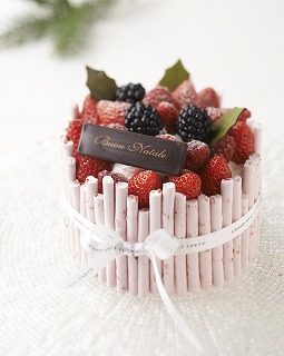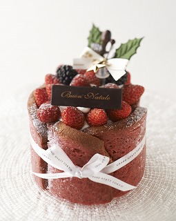 赤ワイン、オレンジジュース、ラズベリー、赤スグリで作ったミックスベリーシロップにたっぷり漬けた自家製ブリオッシュ生地の中には、クレームブリュレとベリーフィリングをサンドし、フレッシュベリーを飾った色鮮やかなケーキ。トップにたくさんのベリーを飾り、クリスマスプレゼントのようにケーキにリボンをかけ、クリスマスらしさを演出しました。