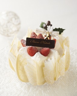毎年大人気のクリスマスショートケーキ。自家製ベリーシロップをしみ込ませたスポンジ生地にたっぷりのホイップクリームと真っ赤ないちごをふんだんにつかい、聖なる夜に舞い降りたエンジェルの羽のようにホワイトチョコレートをまとわせました。羽の部分にはヒイラギの模様をあしらった、とても華やかなケーキです。