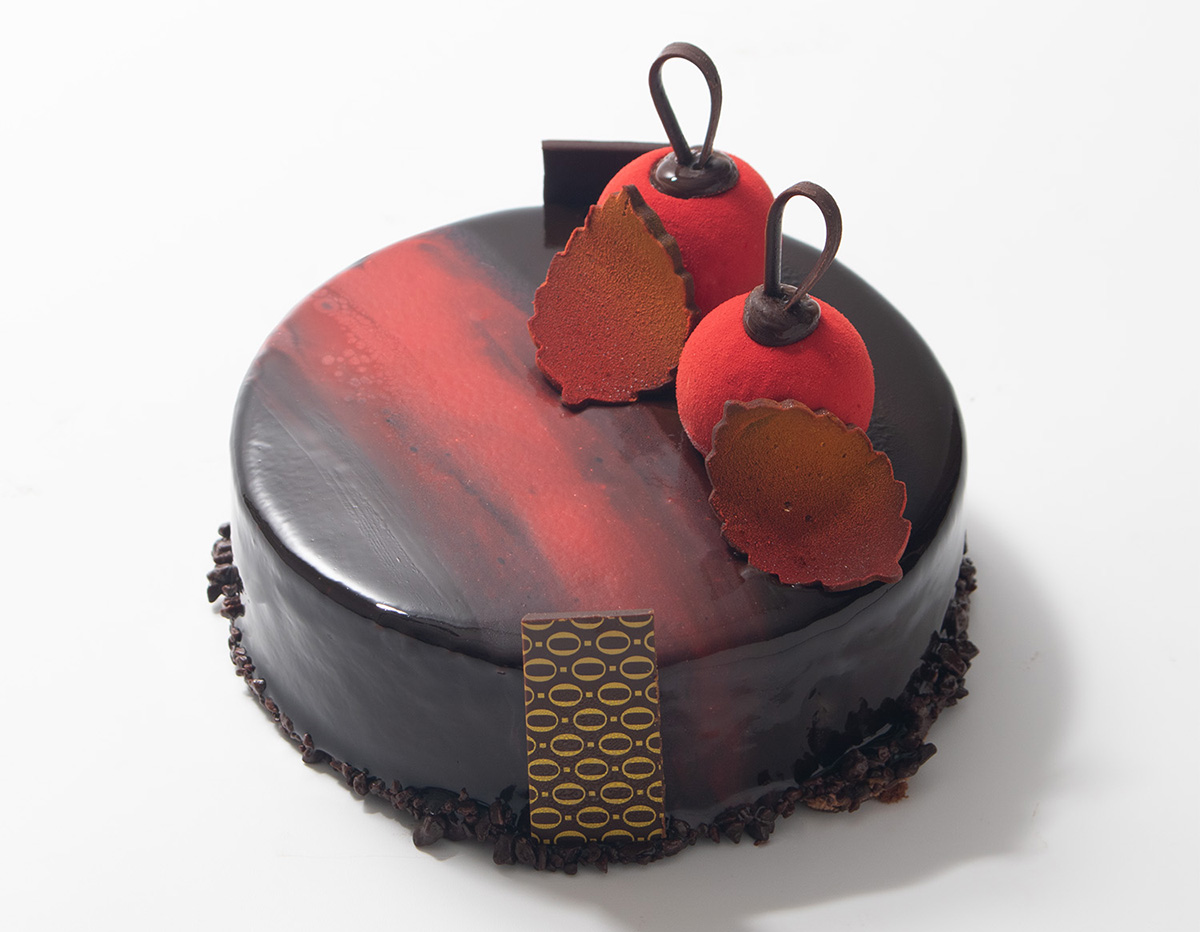 ブボ・バルセロナを代表する「シャビーナ」のクリスマス限定デザインケーキ。鮮やかな赤いグラサージュに、クリスマスツリーを彩るオーナメントのムースと、ヒイラギのチョコレートを添えて、心弾むようなクリスマスを演出。シナモン、ナツメグ、クローブ、5種の黒コショウなど数種類のスパイスを使用。オリーブオイルを使用したアーモンド生地、ダークチョコレートのムース、チョコレートプラリネを合わせ、艶やかな美しいチョコレートのグラサージュで仕上げている。