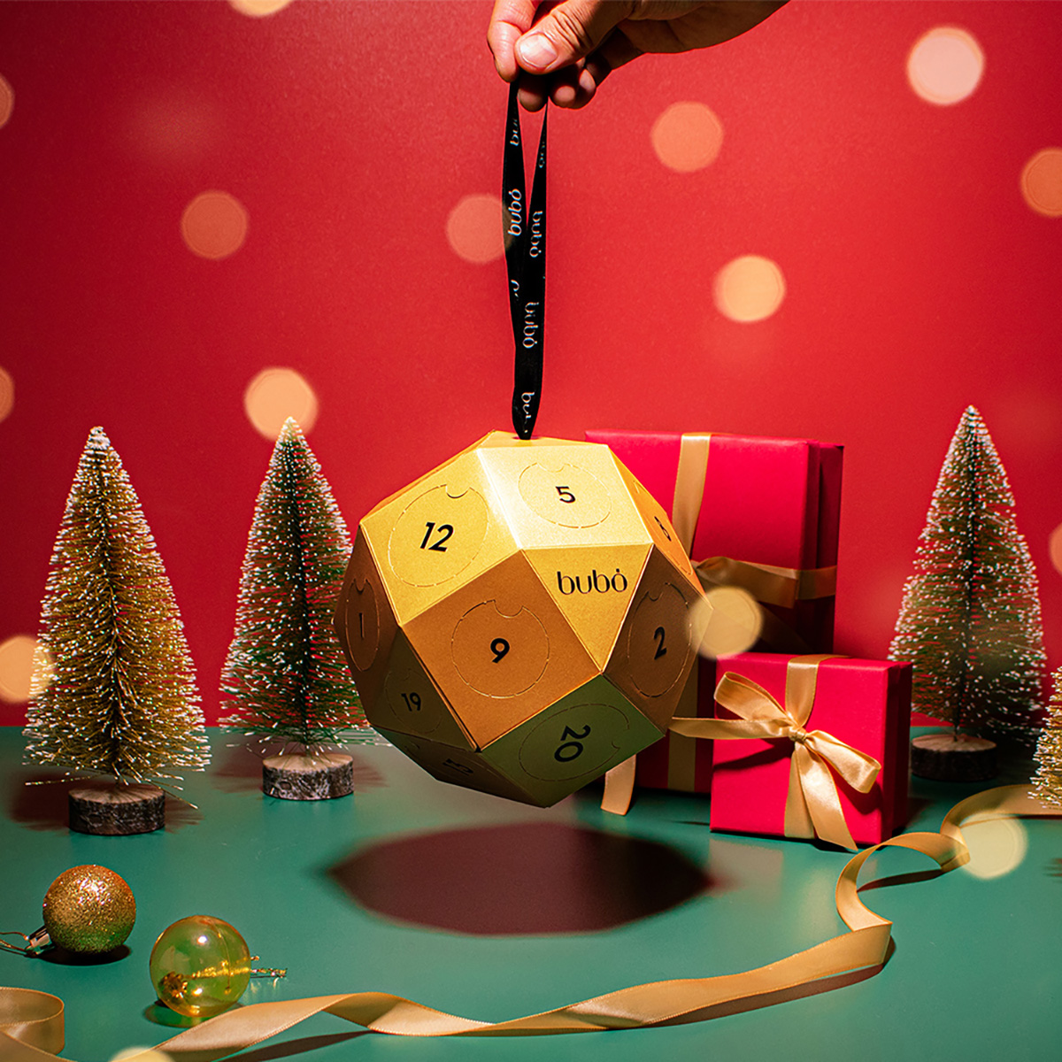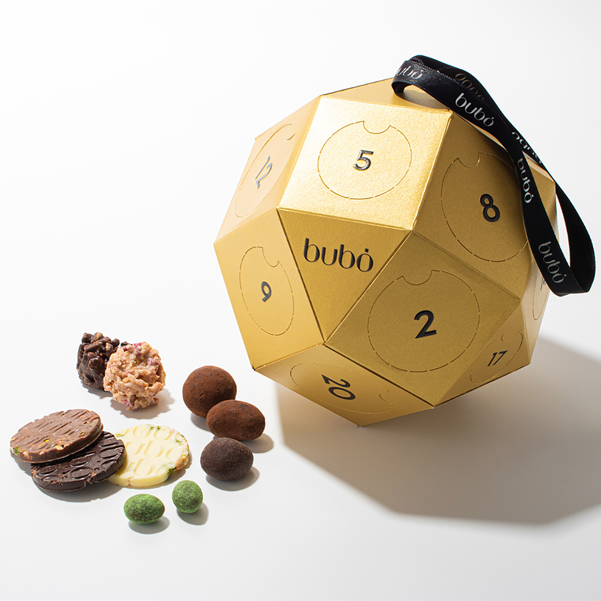 ブボ・バルセロナを代表するチョコレートがたくさん詰まった、ゴールドに煌めくスペシャルなアドベントカレンダー。扉の中には、大人気のチョコフルーツを始め、チョコロックや、マンディアン、チョコレートバーなど、全24種類のチョコレートが入っている。リボン付きで、クリスマスツリーや部屋に飾っても楽しめる。