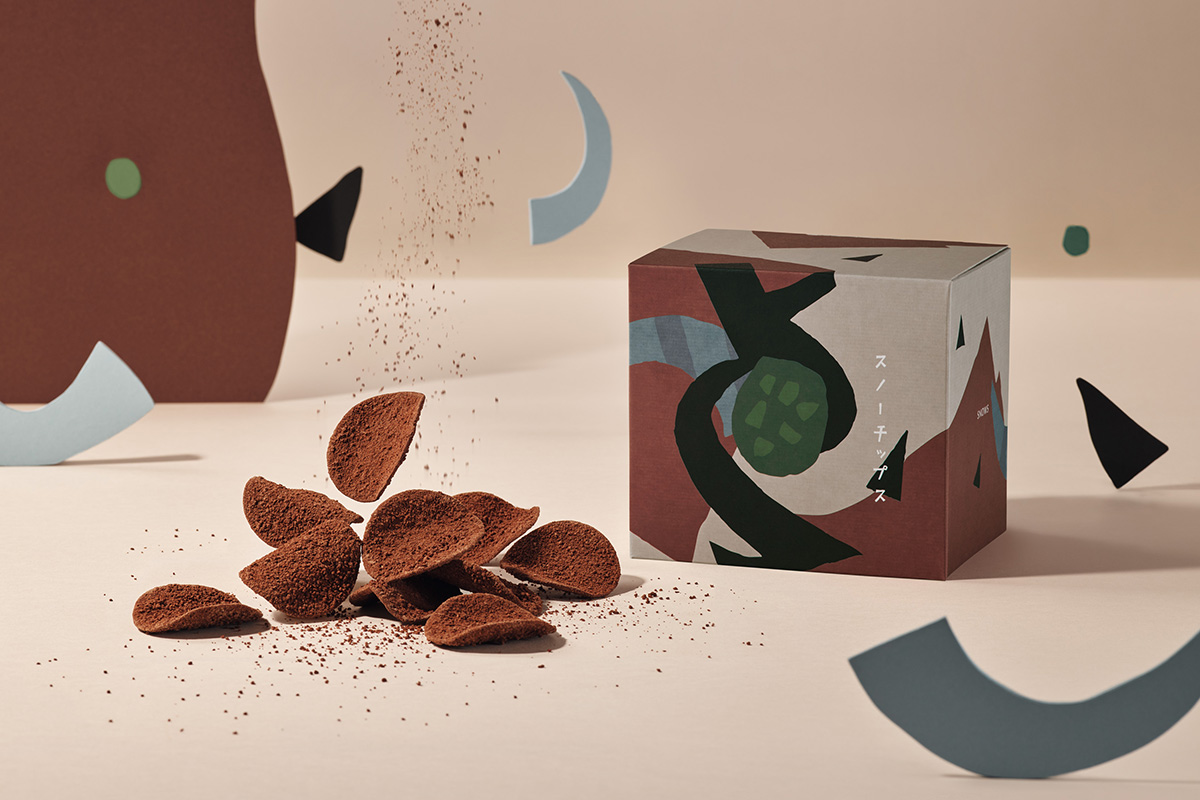 トリプルチョコレートの濃厚さ、粉雪のような口どけ広がるチョコレートチップスカカオの豊かな風味が広がる、一度食べたら忘れられない粉雪のような口どけのスノーチップス。生地に練り込んだチョコレート、チップスに噴霧したチョコレート、最後に纏わせる粒状のチョコレートのトリプルチョコレートが生み出す絶妙な美味しさを楽しめる。チョコレートをたっぷり練り込んだ生地は極限まで薄くし、独自の揚げ焼き製法で作り上げるサクッとした食感が特徴。