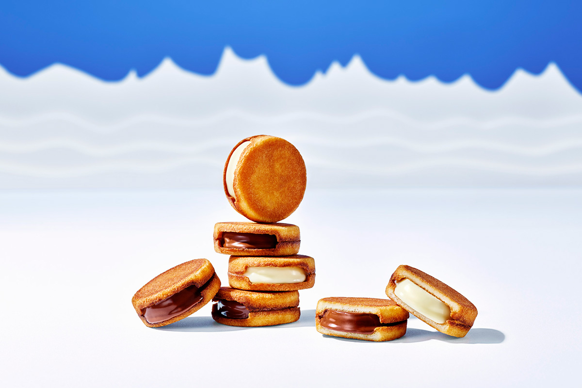直火でひとつひとつ挟み焼きしているラングドシャの香ばしいカリカリ感と、生チョコレートのなめらかさの両方を実現した、SNOWSを代表とする生チョコレートサンドクッキー「スノーサンド」。累計販売2,000万枚突破の本商品は、濃厚でコクのある冬の放牧牛乳を使って仕上げた生チョコレートで、ミルクの風味が感じられるリッチな味わいが特徴。さらに、SNOWSの世界観を作りあげる“⼭の版画家”大⾕一良さんの作品「春を待つ日」がデザインされたオンライン限定デザインパッケージが登場する。