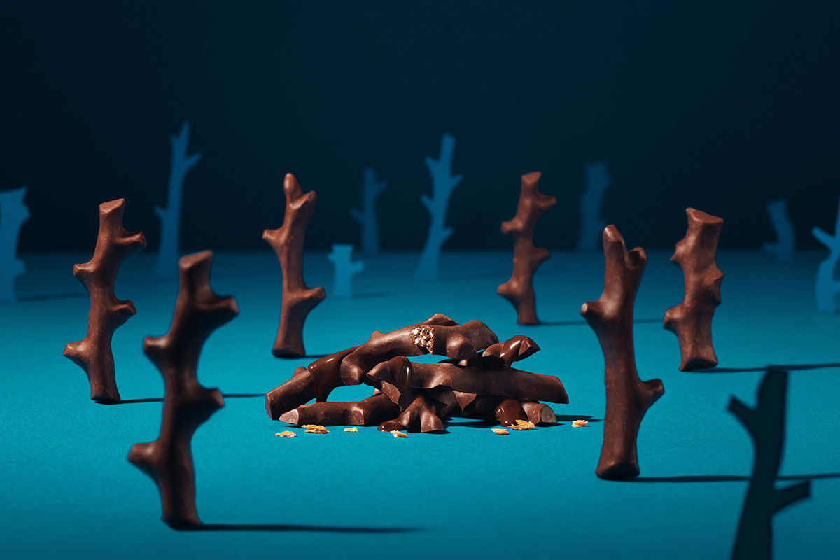 薄く焼いたクレープ生地を砕いたフィアンティーヌと、ローストアーモンドを細かく刻み、香ばしいパイを混ぜ込んだ、サクサク食感も楽しめるクリスピーチョコレート。ミルクチョコレートとスイートチョコレートの絶妙なブレンドでミルキーな味わいが楽しめる。版画家 大⾕一良さんの作品「森の見る夢」の木々をモチーフにした3つの形が特徴のチョコレート。