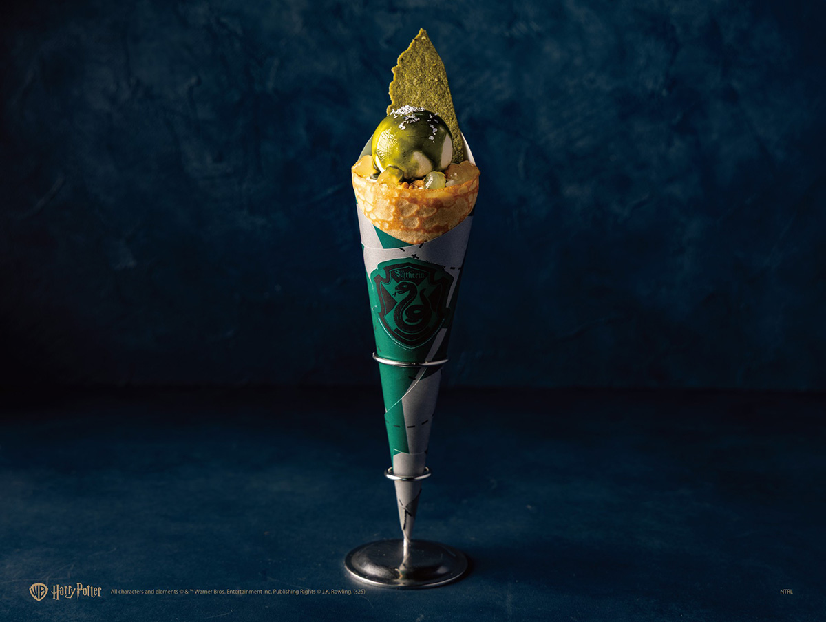 気高さ、野心、利口さを司るスリザリンをイメージしたグリーンティーとベルガモットコンフィチュールのクレープ。抹茶のほろ苦さとベルガモットの香りがアクセント。