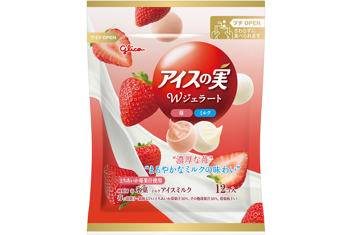江崎グリコ「アイスの実」の新商品、1袋で苺とミルクの2つの味が楽しめる「アイスの実Wジェラート<苺・ミルク>」が、2025年11月24日(月)より期間限定で販売される。