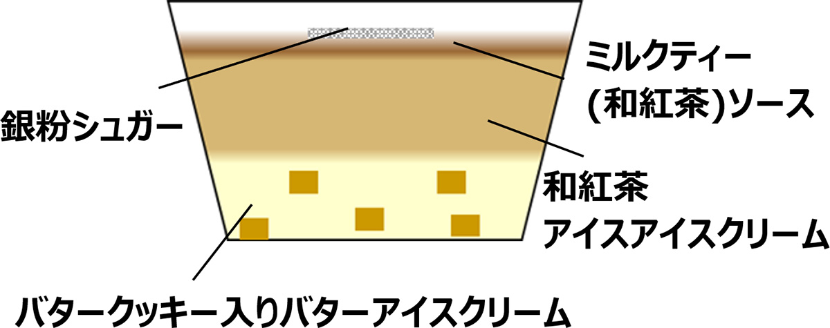 ハーゲンダッツ「スペシャリテジャポネ 和紅茶バタークリームケーキ」は、こだわりの素材を使用した、和紅茶とバターの風味が織りなす、スイーツ仕立てのアイスクリーム。バタークッキー入りのバターアイスクリームに、華やかな香りの初摘み一番茶を使った、和紅茶アイスクリームを重ねている。天面にはミルクティー(和紅茶)ソースと銀粉シュガーをあしらい、見た目も味わいも上品に仕上げている。