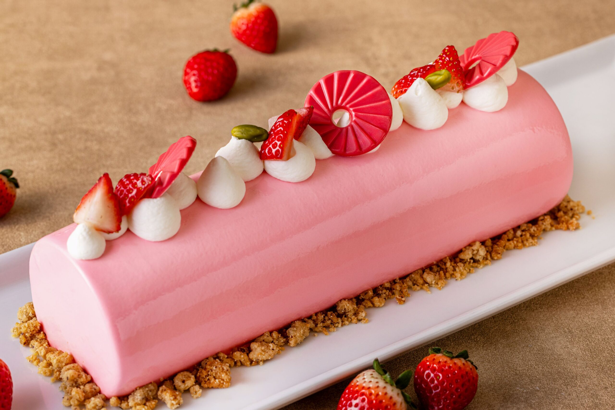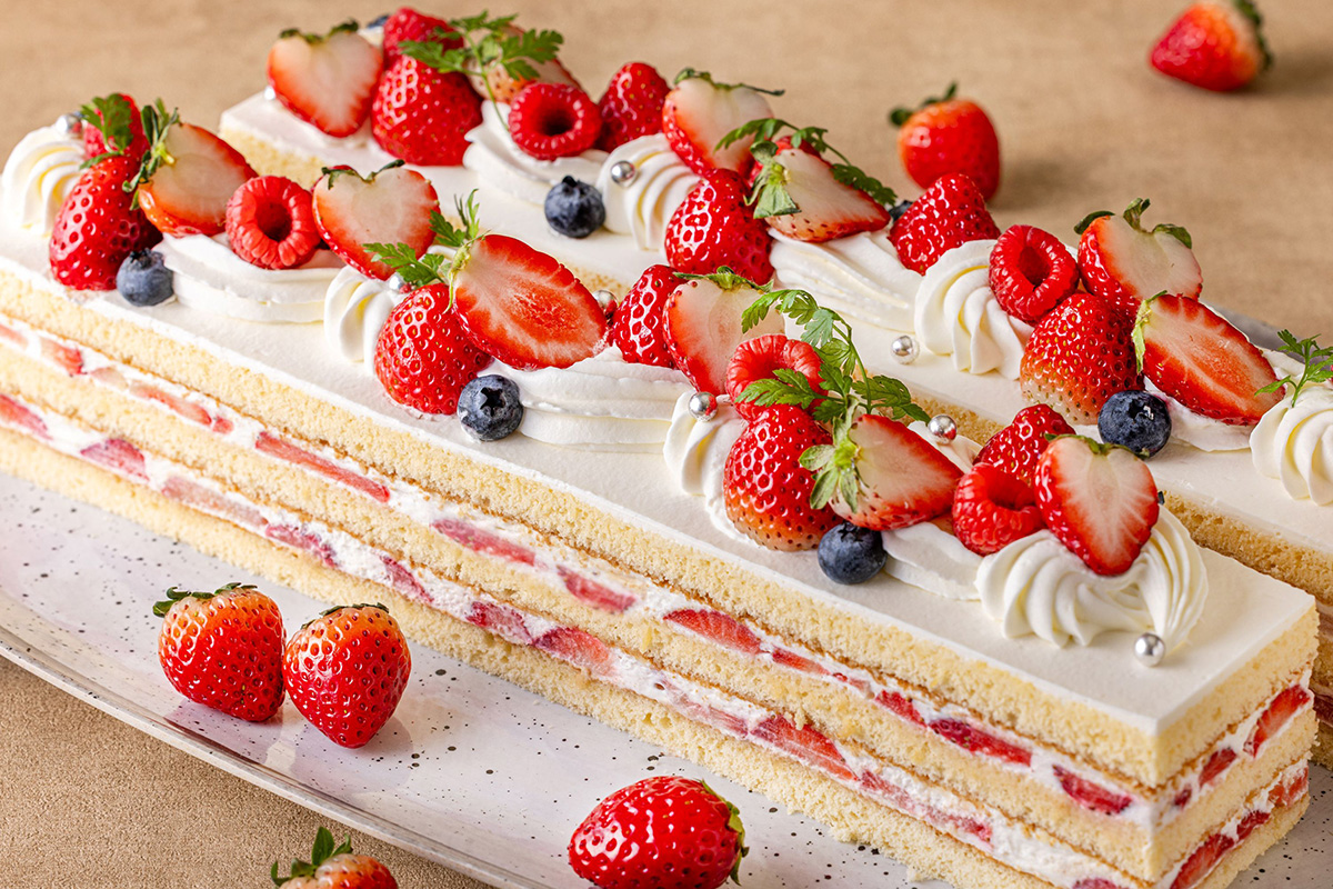 カスタードとバタークリームを合わせたクリームに、アーモンドプードル入りの風味豊かな生地を重ね、苺の酸味を調和させたフランス伝統のケーキ「フレジエ」は、苺の美しい断面が特徴。