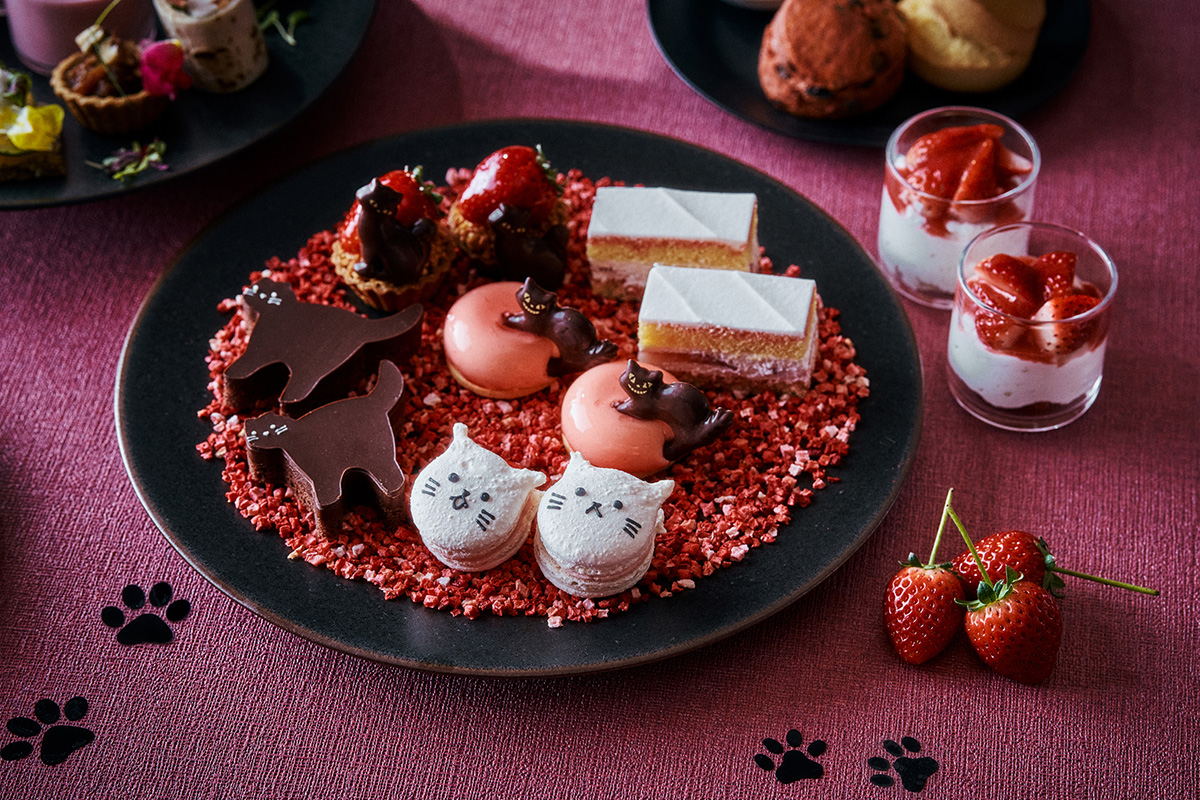 「ストロベリー&キャット アフタヌーンティー」は、真っ赤に実った旬のいちごを主役にしたスイーツとセイボリーに、猫のモチーフを散りばめ、かわいさと美味しさを兼ね備えた内容で構成されている。スイーツは、猫の形にくり抜いたチョコレートとチョコレートスポンジを重ね、ビターで大人の味わいに仕上げたチョコレートケーキをはじめ、いちごガナッシュをサンドし、手作業で猫の表情を描いたマカロンなど全6種類を用意する。