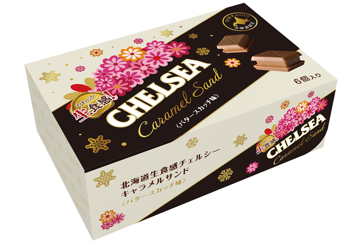 北海道限定で販売している「北海道 生食感チェルシー バタースカッチ味」の新感覚進化系スイーツとして「北海道生食感チェルシー キャラメルサンド バタースカッチ味」が、2025年12月15日(月)の新千歳空港 総合土産品店の発売を皮切りに、北海道エリア限定の土産菓子として順次道内で販売される。