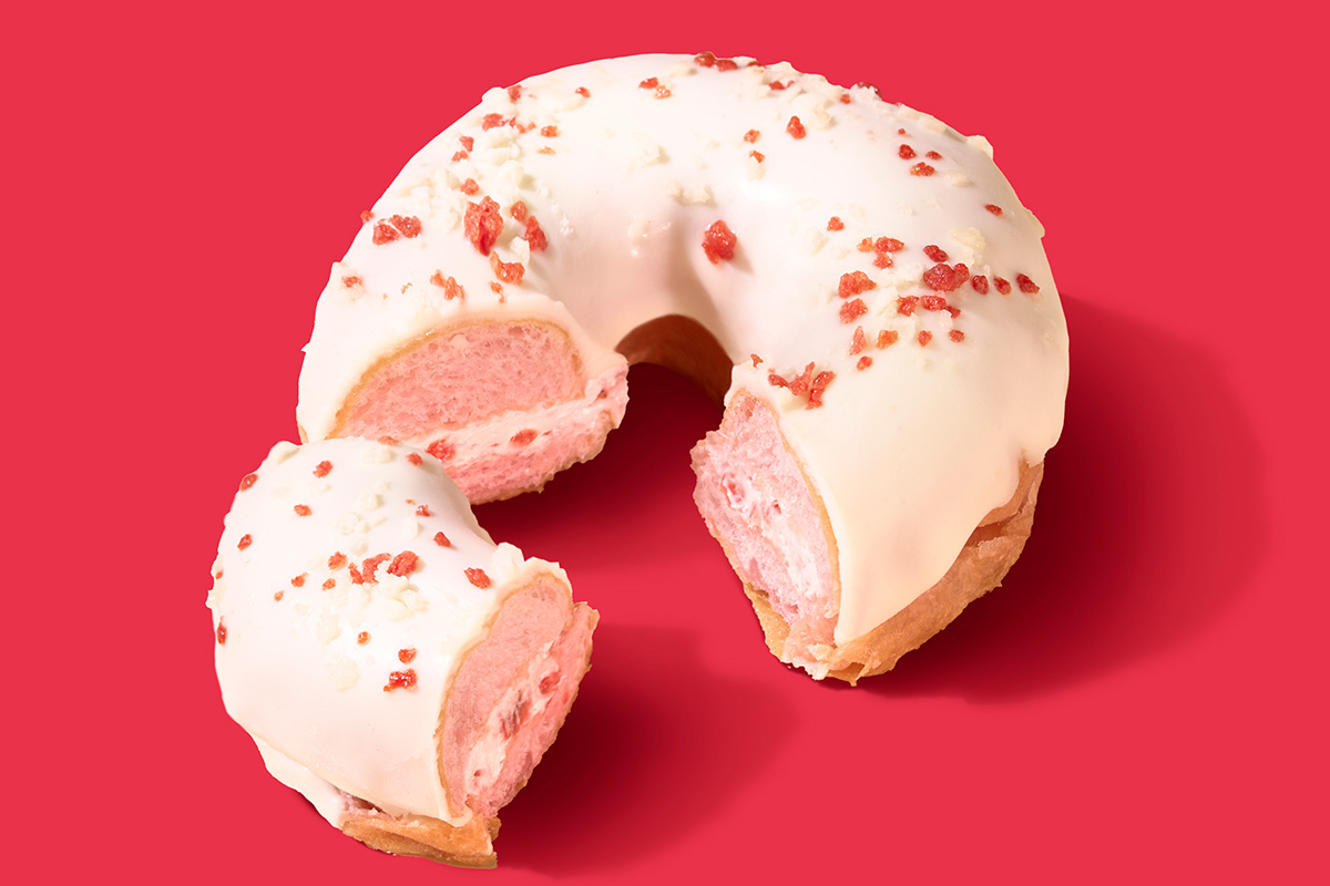 ピンク色のドーナツ生地に、いちご果肉入りミルクホイップをサンド。ホワイトチョココーティングと2種類のクランチをトッピング。