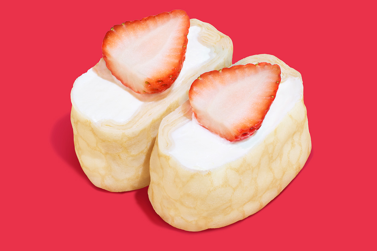 もちっとしたクレープ生地でふわふわのミルクムースを包み、いちごをトッピング。