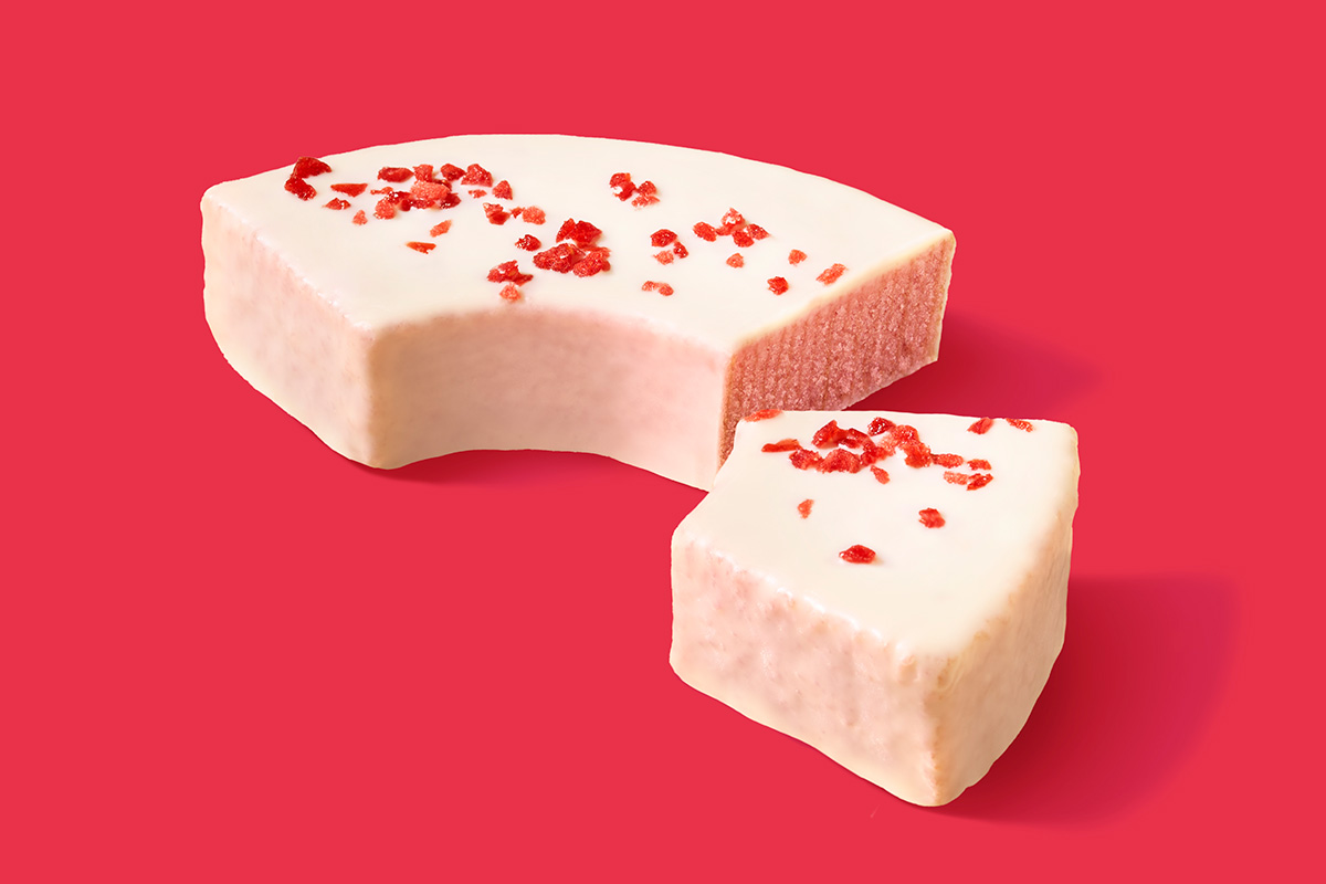 いちごピューレといちごパウダーを加えたバウムクーヘンに、ホワイトチョコをかけ、いちごフレークをトッピング。