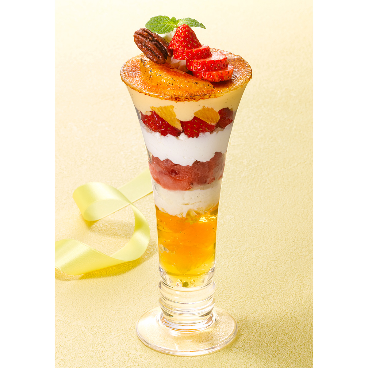 「苺と不知火のブリュレパフェ」は、カリッと香ばしくキャラメリゼした濃厚なクレームブリュレに旬の甘ずっぱい苺と不知火、ピーカンナッツ、塩キャラメルアイス、ホイップクリーム、ストロベリーソルベ、バニラアイスクリームを重ねている。最後の層を不知火とミント&レモングラス風味ゼリーにすることで、春らしい甘ずっぱさと爽やかさの余韻が残る⼀品。