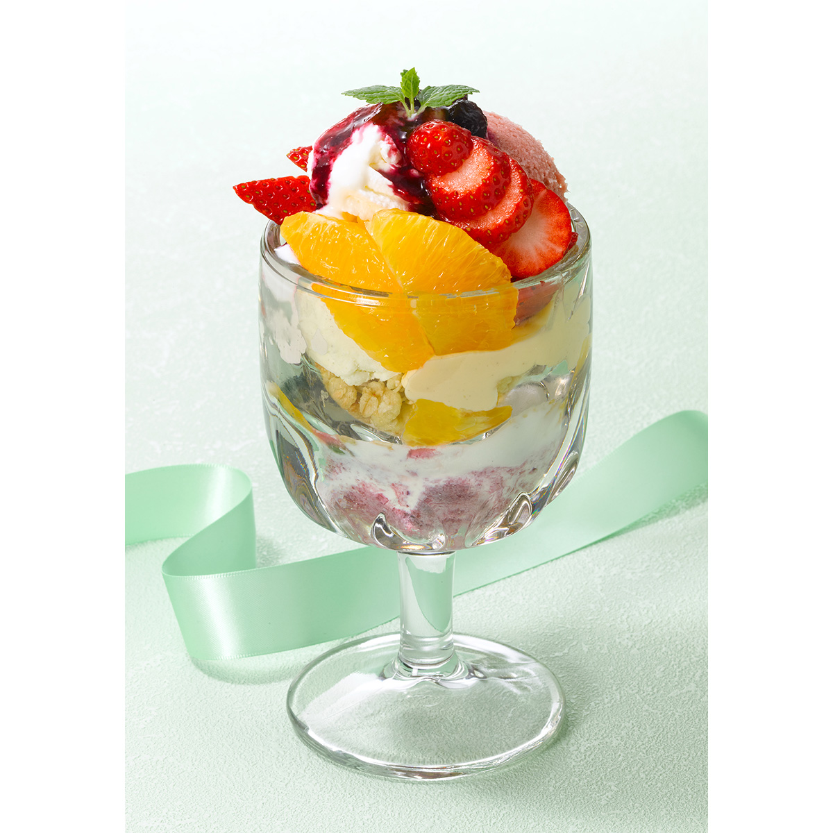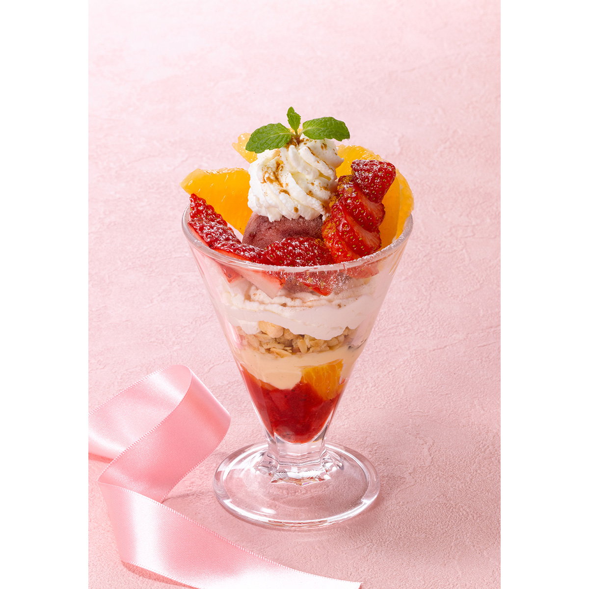 「苺と不知火のパフェ~春爛漫~」は、パフェグラスに沿うように旬の苺と不知火を並べ、ストロベリーソルベ、ホイップクリーム、フルーツグラノーラ、カスタード、ストロベリーソースを重ねている。苺の赤、不知火のオレンジ、ミントのグリーンが春らしい彩りを演出。仕上げにシナモンパウダーをふりかけることで、スパイシーな香りが苺と不知火の甘ずっぱい爽やかな味わいをさらに引き立てる。