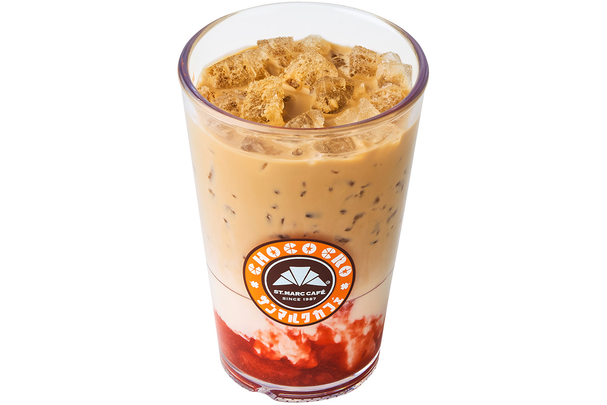 「プレミアム ICHIGO ロイヤルミルクティー」は、サンマルクカフェで⼈気のロイヤルミルクティーに、果⾁たっぷりのいちごソースとコンデンスミルクを合わせた。⾚・⽩・茶⾊の美しい 3 層のグラデーションは⾒た⽬にも華やか。混ぜ合わせることでコクのあ