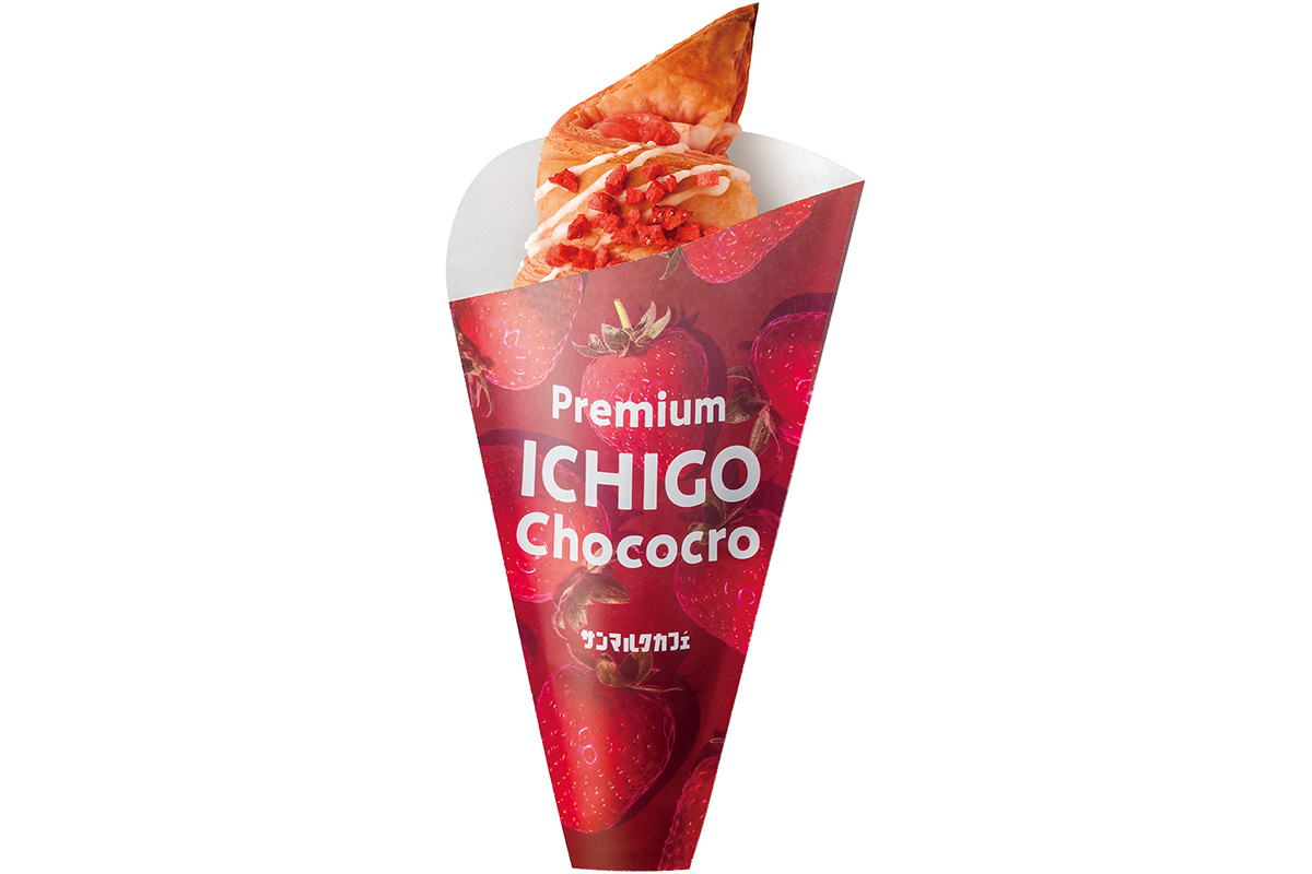 「プレミアム ICHIGO チョコクロ」は、いちご⾵味のクロワッサン⽣地を使⽤。中にはいちご顆粒⼊りチョコレートと、酸味と⽢