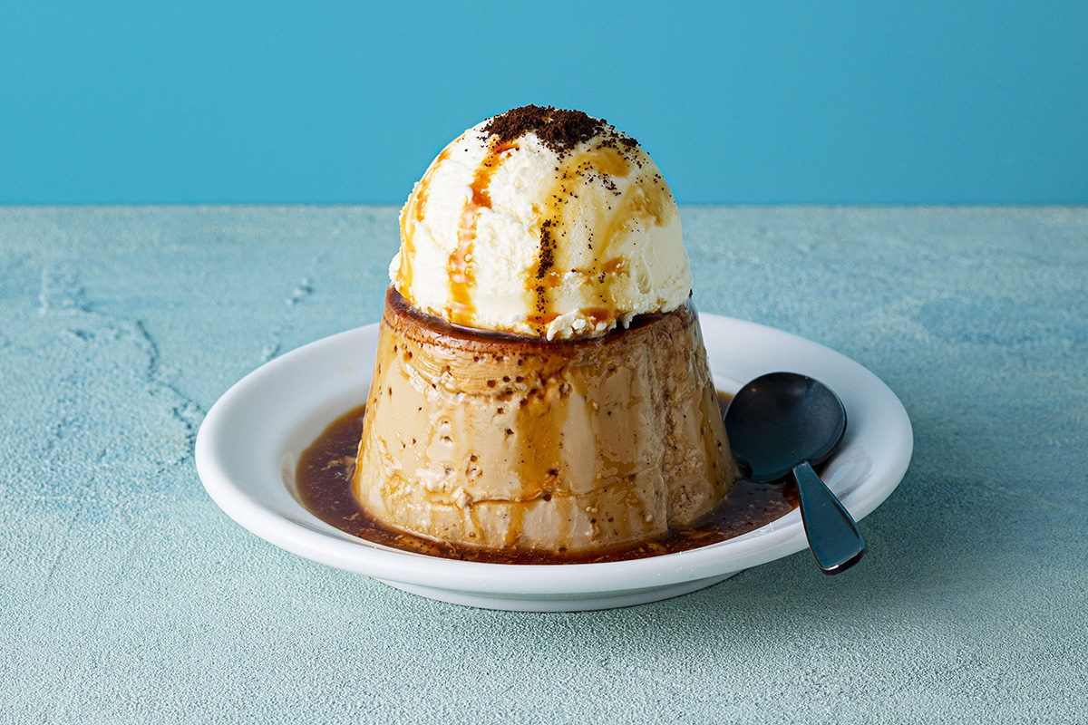 大きめサイズのコーヒープリンの上にアイスがのった、ビジュアルインパクト抜群な一品。ほろ苦いコーヒーの香りを閉じ込めた、至福の「大人のためのプリン」です。 なめらかでコクのあるコーヒープリンに、やさしい甘さのカラメルを合わせ、上にはアイスと挽いたコーヒー豆をトッピング。「デザートでもあり、一杯のコーヒーでもある」を目指した、深い余韻が広がるご褒美プリンです。