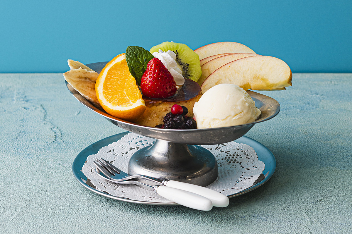 自家製プリンを主役に、バニラアイスと彩り豊かなフルーツをたっぷりと盛り付けた人気デザートです。固めのクラシックプリンは甘さ控えめ。そこに、いちご・りんご・オレンジ・バナナ・キウイ・ベリーのフレッシュな風味が広がり、どこか懐かしくも華やかな一皿です。