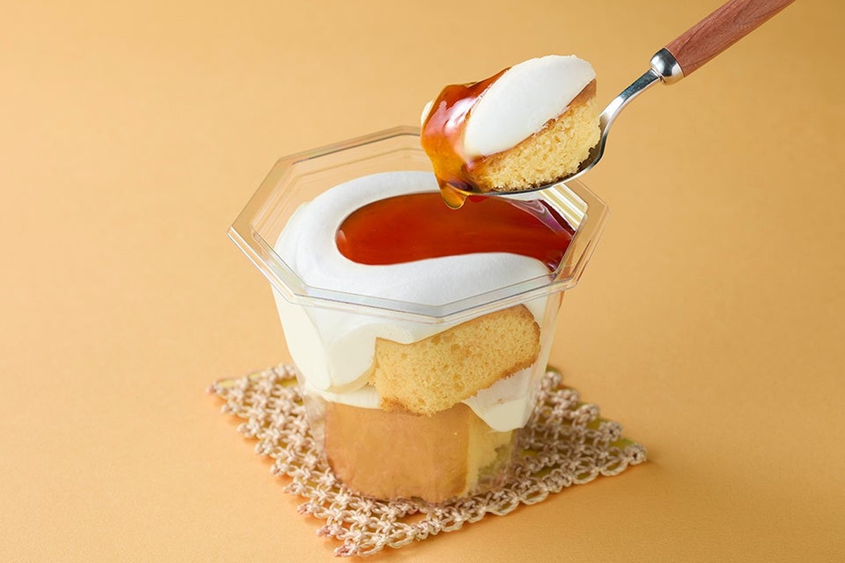 「クリームと食べるとろ生カステラ」は、卵黄と蜂蜜を加えたふんわりしっとりのカステラ生地の上に、北海道産生クリームを使ったミルククリームをたっぷりと絞り、さらにビターなカラメルソースをトッピングした3層構造のスイーツ。カステラのやわらかな甘みと生クリームのまろやかなコク、そしてほろ苦いカラメルソースが重なり合い、食べるごとに味わいの変化が楽しめる仕上がりだ。「わスイーツ」シリーズとして、和のテイストを取り入れながらも洋スイーツならではのリッチさを加えた新感覚の一品となっている。