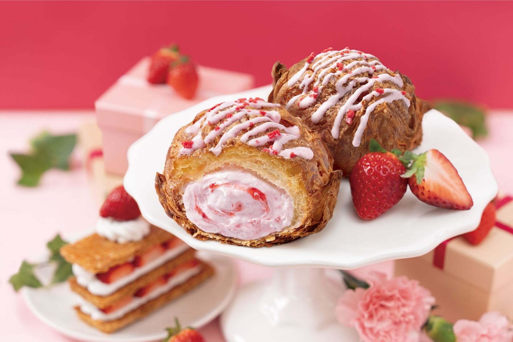 新商品の「プレミアム苺ミルフィーユシュー」は、生地表面に苺チョコと苺の顆粒をあしらい、見た目も華やかに仕上げた一品。中には果肉感あふれる苺クリームをたっぷりと詰め込んでおり、パリパリのデニッシュ生地との組み合わせが楽しめる。価格は390円(税込)で、販売期間は2026年5月1日(金)〜5月31日(日)となっている。