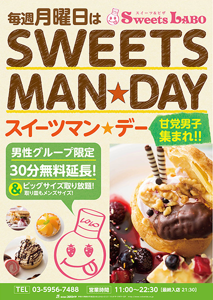 2012年12月3日(月)より「スイーツ&ピザ Sweets LABO」池袋サンシャイン60通り店で男性グループのお客様へのサービスを行う“スイーツマンデー”を開始する。