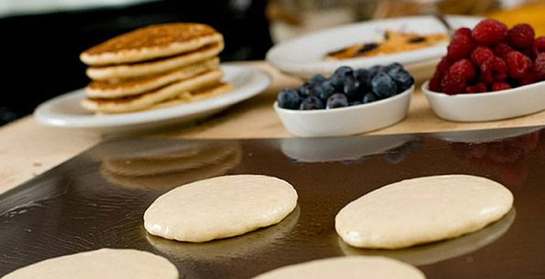 「スラッピーケークス」の大きな魅力は、テーブルにビルトインされたホットプレートで、パンケーキの生地やトッピングを選び自分で調理できること。