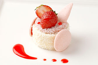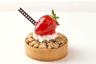 酸味を利かせたストロベリームースと、口どけの良いイチゴクリームが入ったココナッツムースのハーモニー。ココナッツが香るアーモンドのダックワーズとともにお楽しみください。