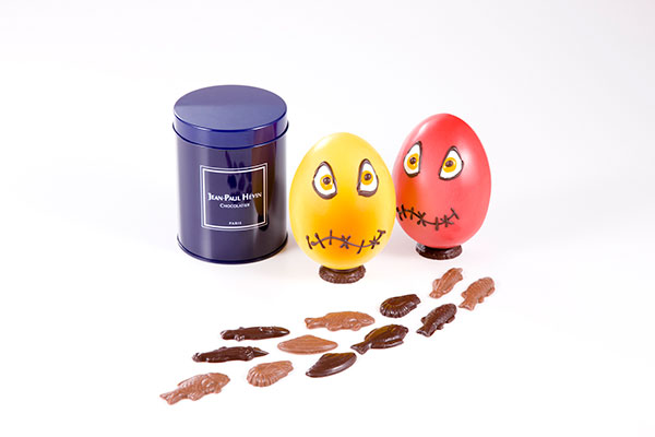 毎年人気のスタイリッシュな卵形のショコラに、今年はユニークな顔が描かれた「ルッフ デュール」が登場。「ルッフ デュール」”ハードボイルドな卵”という意味で、固ゆで卵という意味ももつ。色はジャン=ポール・エヴァンの今期のテーマ「火遊び」に合わせて黄色と赤色の2種類。卵の中から飛び出すのは、海の生き物の形をしたショコラ「フリチュール」。探し当てた後にも楽しみが残っている。