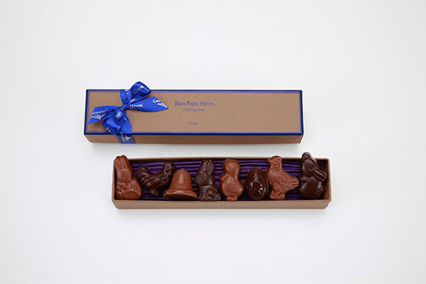動物や鐘、卵をかたどったパックならではのショコラ。それぞれレとノワールをご用意しました。中にはプラリネやヌガティーヌ、ジャンドゥジャが入っています。