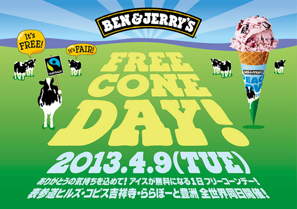 アメリカ生まれのプレミアムアイスクリーム「BEN&JERRY’S(ベン&ジェリーズ)」全店にて、アイスクリーム(スモールサイズ)を無料で配布する「フリーコーンデー」を2013年4月9日(火)に実施する。