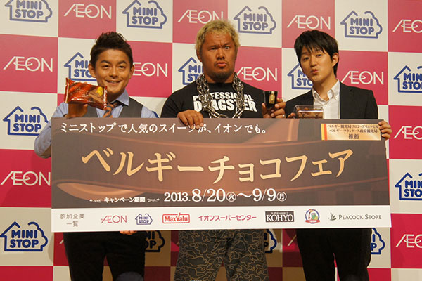 この日のイオン×ミニストップ「ベルギーチョコフェア」発表会では、お笑いコンビ「スピードワゴン」の井戸田潤、スイーツ好きプロレスラー真壁刀義、予備校講師林修先生のものまねで人気の村瀬雄一が登場。スイーツを試食しリアクション対決を行った。