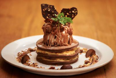 ココア生地のパンケーキにカスタードクリームをサンドして、渋皮栗や香ばしいナッツを散りばめ、自家製マロンクリームとラムレーズンアイスクリームをトッピングした贅沢な「栗と木の実のカスタード」(¥1,080)や、こんがりとキャラメリゼしたフレンチトースト風のパンケーキ「さつまいもと林檎のフレンチパンケーキ(¥1,080)に、フレッシュないちじくと洋なしたっぷりのフルーティーな紅茶「いちじくと洋なしのハニーティー」(hot/Ice¥680)が新登場。