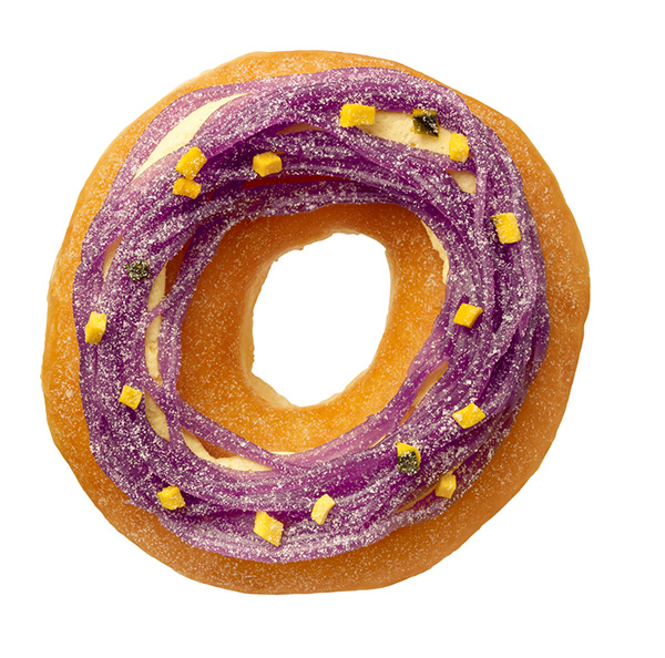 『ムラサキイモ モンブラン』は、秋の食材をふんだんに使ったハロウィンカラー(紫)のドーナツ。スイートポテトミルククリームと紫芋(ムラサキイモ)クリームを贅沢に重ね合わせ、かぼちゃのフリーズドライをトッピング。
