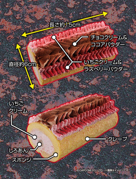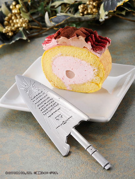 「狩“料”解禁!空の王者リオレウスケーキ」は、『モンスターハンター』シリーズに登場するモンスター、「リオレウス」の甲殻をイメージしたロールケーキで、ゲーム内に登場する大剣「エピタフプレート」を模したステンレス製のケーキナイフと『モンスターハンター4』に登場する加工屋の剣立てを再現したナイフスタンドが付属。