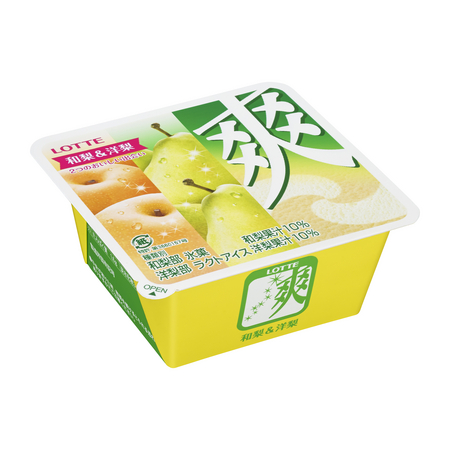 2013年10月28日(月)に人気アイス『爽』から、新フレーバーが登場。秋の味覚の一つ、梨を使った、「和梨&洋梨」。和梨と洋梨のアイスがうずまき状になっている。