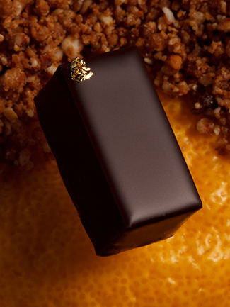 ベネズエラ産のクリオロ系トリニタリオ種(カカオ75%)は、深く炒ったヘーゼルナッツやコーヒーのような、素晴らしく濃厚なアロマを持っています。ナノ化したショコラを5%加えるだけで、このショコラの野生の魅力が目覚め、さらに奥深い香りの表現が可能になります。香りの持続力も強まります。ナノ化したショコラはただ単に技術が新しいだけでなく、他のクーベルチュールショコラとブレンドすることにより、まるで料理の「だし」や「旨み」のような効果を発揮します。エンロービングショコラはカカオ72%のショコラ ノワール。ガナッシュの存在感を最大限に発揮するように、ごくごく薄くかけます。ボンボンショコラ ナノ ノワールはnano chocolatのシリーズのプロローグです。