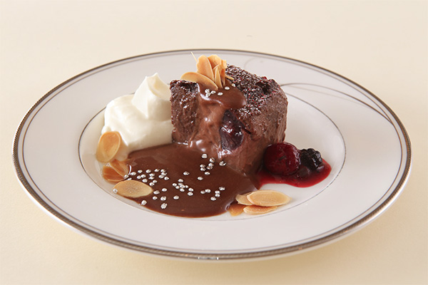 今回のショコラフェアでは、パフォーマンスメニューとして「ホットチョコレートクラフティ」が初登場。クラフティは、タルト生地の中にさくらんぼを加え、卵、牛乳、生クリーム、砂糖を混ぜた生地を流し込んで焼きあげる、ふわふわなプリンのようなお菓子。カカオ分41%のミルクチョコレートをふんだんに使用した濃厚なチョコレートクラフティを、温かい状態のまま、シェフがお客さんの目の前でカッティングしてくれる。トッピングにはシェフ自慢の北海道産牛乳100%の生クリームに加え、チョコベリー、プラリネチョコ、キャラメルミルクチョコ、ストロベリーホワイトチョコの4種のチョコレートソースを用意。ナッツ類やアラザンなどと併せて、好きなトッピングで“自分だけのホットチョコレートクラフティ”を楽しめる。